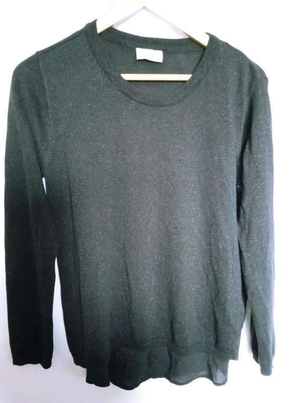 светр гарний,чорний,нарядний,комбінований,тканина трикотаж з люрексом,оригінальний фасон,спинка шовкова з імітацією застібки на гудзики,спинка довша,довжина переду61см,довжина спинки74,пог60,рукав62см,швецький бренд