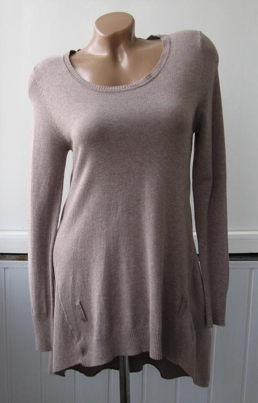 У відмінному стані (без катишків). Один недолік: нерівний низ (фото 5-7). Розмір на бирці S/M. Ширина під руками 40 см., на обхват грудей 86-94 см., ширина в стегнах 50 см., на обхват стегон 90-98 см., Довжина рукава від плеча 62 см., Довжина светра спереду 67 см., Ззаду 85 см. Тканина тепла, м'яка, дуже приємна до тіла. Склад: 30% шерсть, 24% модал, 24% віскоза, 22% поліамід. Одягнено на манекен розміру S з параметрами 85-60-92 см.