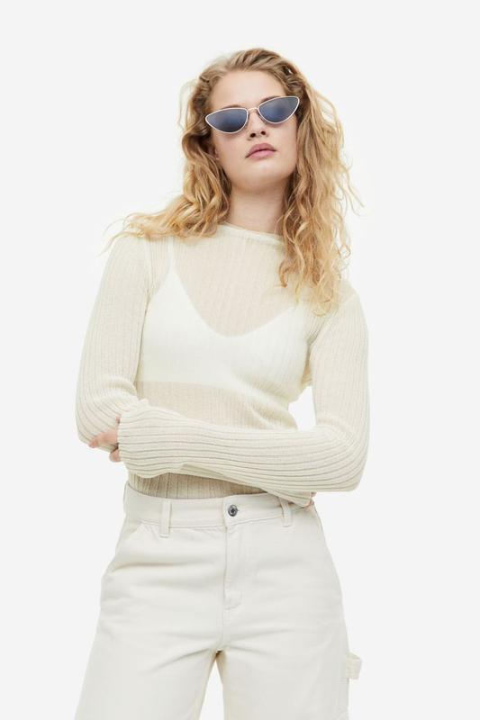 Светр з довгим рукавом по фігурі з м'якого повітряного трикотажу в рубчик з невеликим коміром-стійкою.