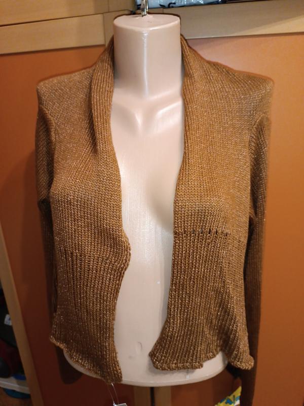 колir коричневый (с добавкой нити золото), размир S, iзины е пару зачибок следует заправить, замиры: длина 49, плечи 41, рукав 69