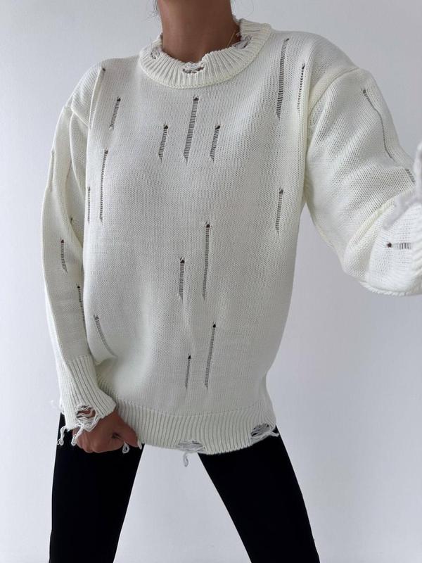 Вязаный свитер свободного кроя, украшенный декоративными разрывами. Модель отличается широким рукавом с заниженной линией плеча и манжетами, на которых также находятся разрывы. Размер 42-46 Больше товаров на нашем сайте