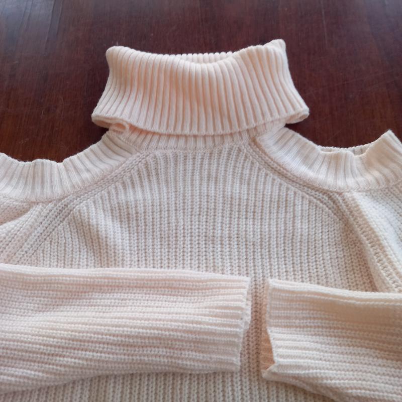 Очень нежный,мягкий,приятный свитер. Слегка открытые плечи. Цвет нежно-розовый,нежно- персиковый.