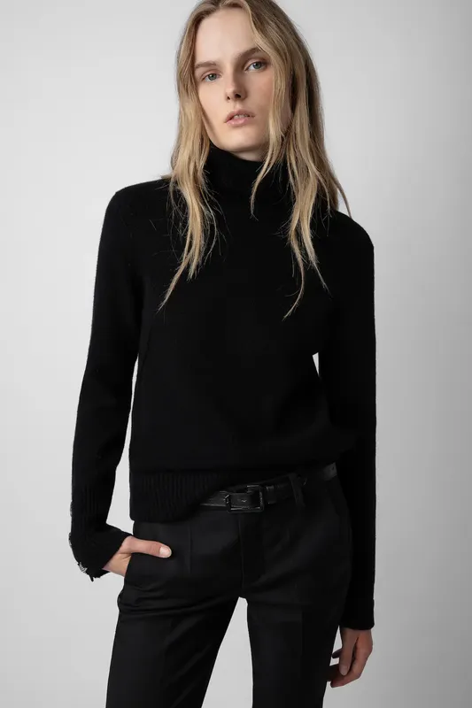 Женский черный вязаный свитер - Манжеты на пуговицах со звездными украшениями и подписью ZV pointelle - Высокий воротник - Длинные рукава и ребристые края