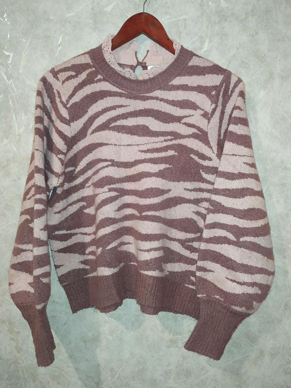 Свитер зебра,с воротничком,при желании его можно заворачивать внутрь. Мягенький и тепленький.