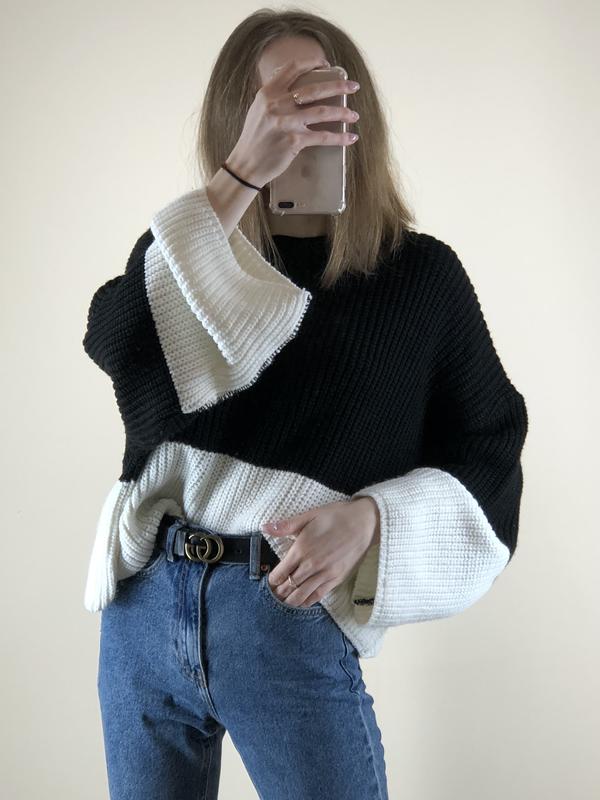 Мега крутой объемный свитерик🖤 Очень стильно смотрится на теле👆 В идеальном состоянии❗️ Размер указан М, за счет свободного кроя можно надевать как OneSize По деталям в дырект💌