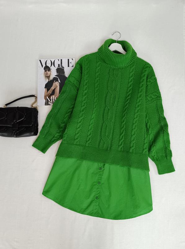🌿зеленый свитер Next свободного кроя с рубашкой обманка из хрустящего коттона Размер:XL Замеры:ПО груди 66 см, длина 90 см, рукав от горловины 70 см