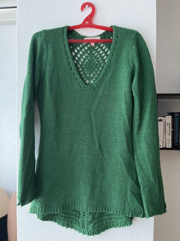Удлиненный теплый свитер с ажурной спинкой,мохер,зеленый,р44-46