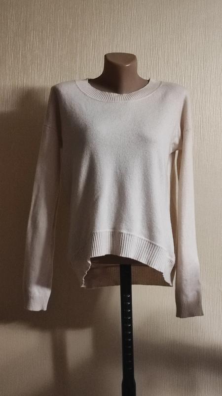 Вишуканий кашеміровий джемпер люксового бренда Hemisphere з круглим вирізом гладкого в'язання, вільного крою. Має широкі манжети та низ у рубчик, занижені плечі. Джемпер сучасного прямого вільного крою. Перед трохи коротшим за спинку. Розмір: М. 38. НОГ — 50 см. НО низу — 48 см. Рукав від шиї — 70 см. Довжина — 57 см. Матеріал: 100% кашемір,