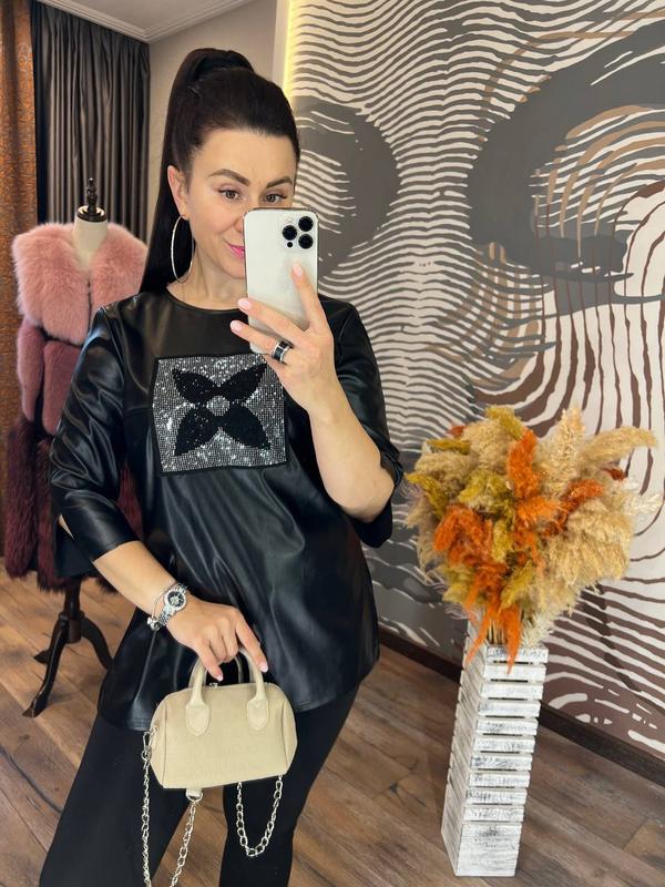 яскрава і ефектна кофточка приталеного крою зі зручними розрізами по бічних швах і рукавах, виготовлена з якісної екошкіри на атласній основі, декорованої пришитою аплікацією з блискучих страз вона має чудовий вигляд і сідає на фігуру будь-якого типу, підкреслюючи її красу і достоїнства розміри 46, 48, 50, 52 46 довжина 68-70 см, п г 48-50 см, довжина рукава від шиї 52 см 48, 50, 52 + 2 см по грудях і довжині виробу