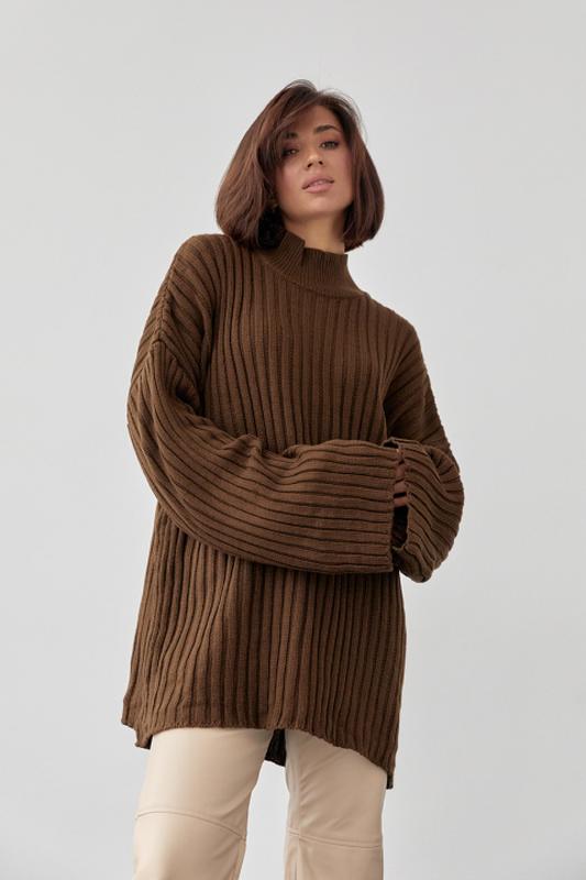 Модель повністю виконана з машинної в'язки в широкий рубчик. Кругла горловина доповнена коміром-стійкою. Колір:сірий, кремовий, темно-коричневий Матеріал В'язка Склад тканини 98% акрил, 2% поліамід Розмір універсальний:44-50 Довжина виробу:72см Довжина рукава від горловини:77см Об'єм грудей:128см Об'єм стегон :124см арт221124