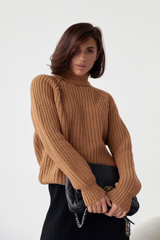 Модель повністю виконана з фактурної машинної в'язки у техніці "резинка". Прямий низ і рукави закінчуються в'язкою у вигляді манжет, а кругла горловина доповнена високим коміром, що складається вдвоє. Колір: коричневий, молочний, темно-коричневий Матеріал: В'язка Склад тканини: 70% акрил, 30% поліестер Розмір універсальний:42-50 Довжина виробу :56см Довжина рукава від горловини:72см Об'єм грудей :100-110см арт4635