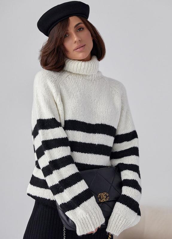 🔥У светрі висока горловина складається вдвоє, пройми опущені, прямий низ і довгі рукави закінчуються в'язкою у вигляді манжети. Сам виріб в основній частині та на рукавах декорований горизонтальними смужками контрастного кольору. 🎨Колір:молочний, бежевий, чорний 🧵Матеріал В'язка 🧵Склад тканини 80% акрил, 20% поліестер ‼️Розмір універсальний 42-48 ⤵️ Довжина виробу:63см Довжина рукава відгорловини:75см Об'єм грудей:112см Об'єм по низу:80-100см 💳Ціна :1250грн арт4612 ‼️Для замовлення та детальної інформації пишемо у дірект, або коментарі ⤵️