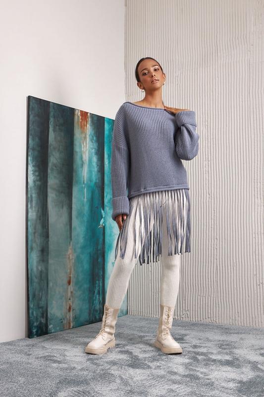 Трендовий джемпер T-силуету з м'якої та ніжної напіввовняної пряжі. Вільний крій, горловина-човник і спущена плечова лінія поєднуються з вертикальним малюнком переплетення середньої щільності. Джемпер декорований вертикальною бахромою. Ультрамодний джемпер, який не дозволить залишитися непоміченою. Довжина виробу близько 52 см (+- 2 см). Ширина під проймою близько 53 см (+- 2 см).