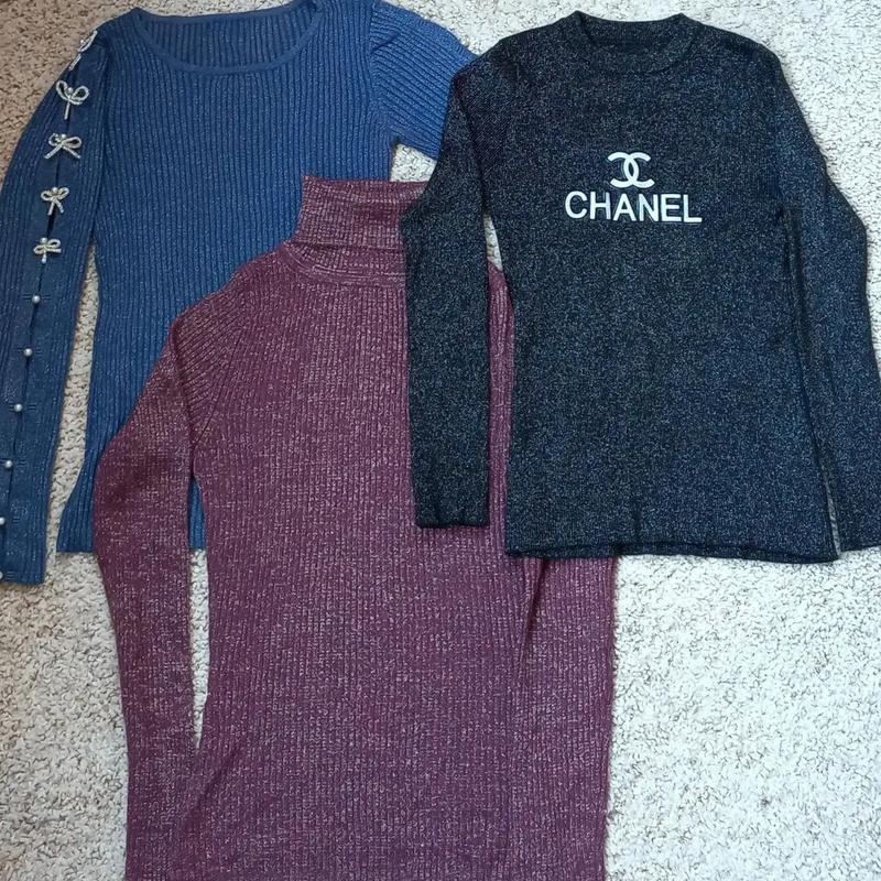 Свитерок чёрный с люрексом с логотипом,,CHANEL,,размер S-M.ЦЕНА♥️270ГРН♥️Свитерок бордовый с люрексом,размер S.ЦЕНА♥️180ГРН♥️Свитерок синий,размер S,с бантиками на рукавах из стразового шнура.ЦЕНА♥️300ГРН♥️.За все три вместе лотом ♥️600♥️грн