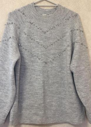 Очень мягкий, приятный на ощупь. Яркие каменцы делают свитер еще более нарядным. Рукав - реглан. Длина - 65 см ПОГ - 50 см ПОБ - 49 см Размер ориетовно по замерам.