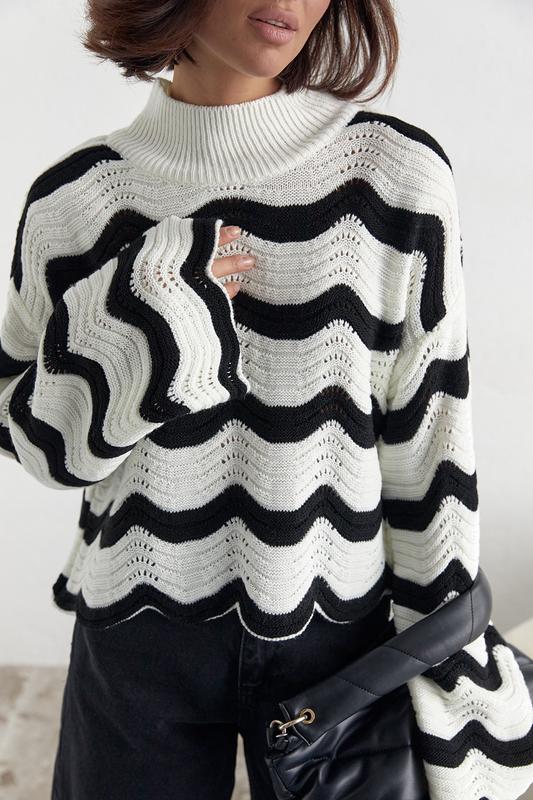 Длина переда изделия, см 48см Ширина под проймами рукавов (над грудью), см 52см Длина рукава от горловины, см 68см Длина рукава по внутреннему шву, см 51см РАЗМЕРНАЯ СЕТКА ХАРАКТЕРИСТИКА ТОВАРУ Страна Турция Материал Машинная вязка Состав ткани 70% акрил, 30% полиэстер Параметры модели 84*60*92 рост 173 Универсальность Замеры одинаковы для всех размеров - особенность фасона модели Размер на фото one size Хочешь добавить модных акцентов своим привычным нарядом - выбирай эту ажурную кофточку с волнистым узором от интернет-магазина LUREX. У модели прямой низ и манжеты длинных рукавов с волнистыми краями. Само изделие выполнено из ажурной вязки с волнистым узором двух цветов. Плечи в кофте опущенные, а круглая горловина дополнена однотонным воротником-стойкой. Ты можешь носить такой модный свитер и как самостоятельный верх в паре с высокими брюками или юбками, и как часть многослойного образа с длинными женскими рубашками, заказывай!