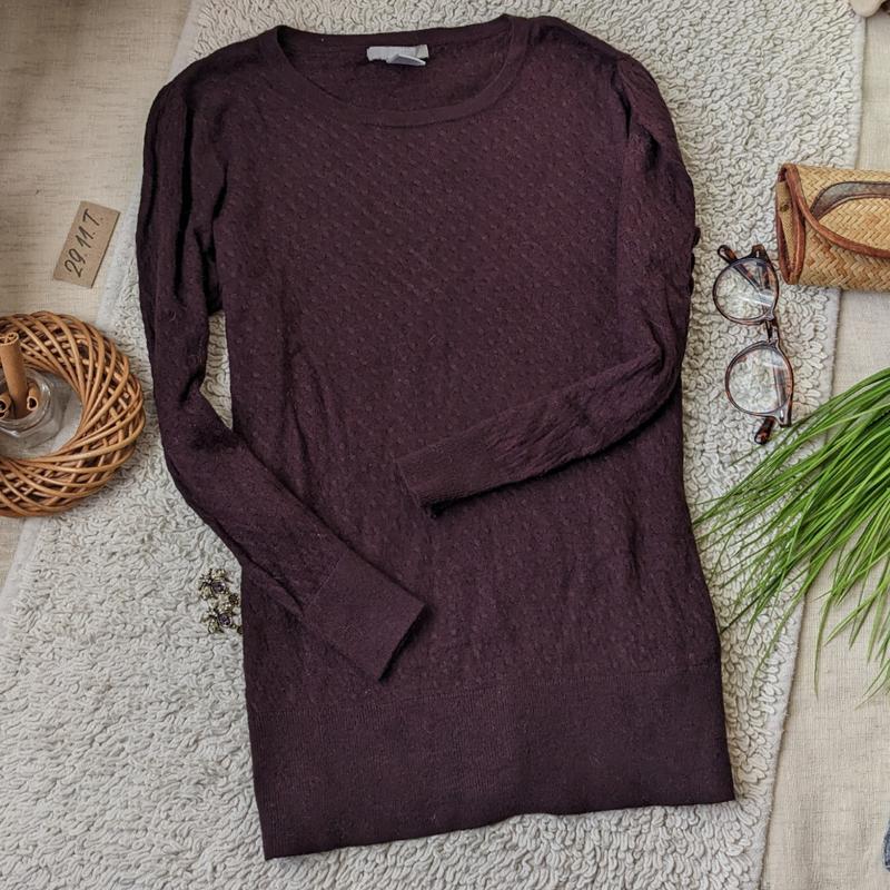 Дуже приємний на дотик светр в'язка косами з шерстю , h&m розмір за етикеткою m 38 спокійно Можна пробувати на s 36 під руками спокійному стані 45 тягну до 60 плечі від шва до шва 36 довжина рукава 44 йде на 3/4 під низ можна одягнути або рубашечку або бавовняний реглан по максимальним точкам 56 стан ідеальний дефектів немає