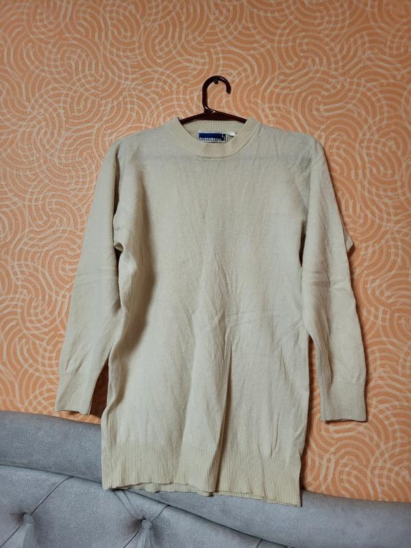 Супер мягкий и очень тёплый,средней плотности)Красивый в сливочном цвете.состояние отличное.размер М ,можно и на С,будет овер сидеть.на фото одет на С. длина 70,рукав 50,подмышками 52,плечи 46.Отправка Новой почтой после оплаты на карту