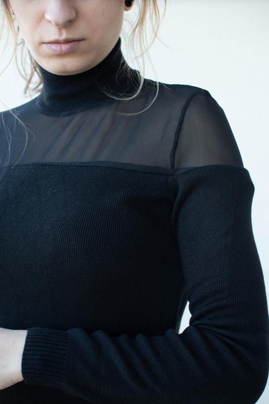 гольфик, очень приятный на ощупь 50%вискозы, тоненький и комфортный, сверху изделия есть прозрачная вставка что робе этот гольф чрезвычайно женственным,рукава и низ на манжете -резинке, не кашлатится. длина 52 ширина 42 рукав 59 плечи 35