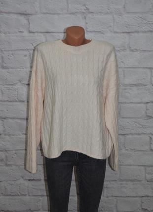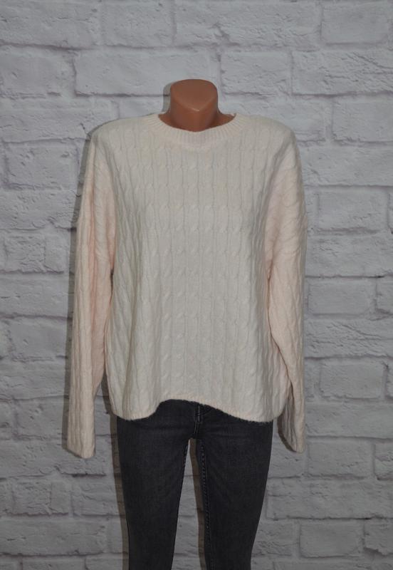 Свитер свободного кроя "H&M" размер-C, за счет кроя хорошо на больше состав: 73% полиэстер 25% шерсть, 2% эластан состояние-новой вещи (рукав-74, подмышки-63, длина-58)