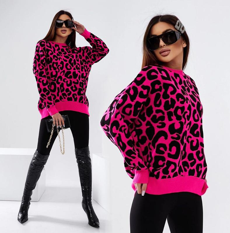 ********************************** Арт: БЧ-1041. Турция. Размер один универсал: 42-48. Ткань: качественная фабричная вязка (70% шерсть, 30% акрил). Цвет: малиновый. Тёплый вязаный свитер с модным леопардовым узором из новой коллекции компании Пальмира займет особенное место в гардеробе девушки. Модель идеальна для повседневного образа на холодное время. Свободный крой с манжетом внизу, круглым вырезом горловины и однотонными манжетами подчеркнёт формы. Рукава на приспущенном плече не стесняют движений. Яркая анималистическая расцветка придаст стилю индивидуальности. Замеры свитера: ОГ до 138 см Длина 75 см Длина рукава от горловины 73 см