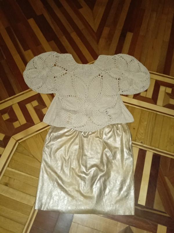 бежевая стильная вязанная вискозная кофта с рукавами фонарики,,длина по спинке 47-48см,ПОГруди 42 см,от плеча по спинке 52 см,длина рукава от края изделия 24см,на фото есть юбка,экокожа