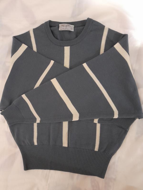 Лёгкий тёплый свитерок свитшот 100 % шерсть от известного английского бреда JAEGER. Шерсть очень гладкая, мягкая, плотная, без ворса и катышек, качество шерсти замечательное, не кашлатится. Состояние отличное, есть ньюас, на внутренней стороне рукава под мышкой были спущенные петли, сейчас видно только на очень близком расстоянии. 2 последних фото, слева - это фабричный шовчик. Грудь 44, рукав летучая мышь от ворота 67, низ тянется 30, длина 49.