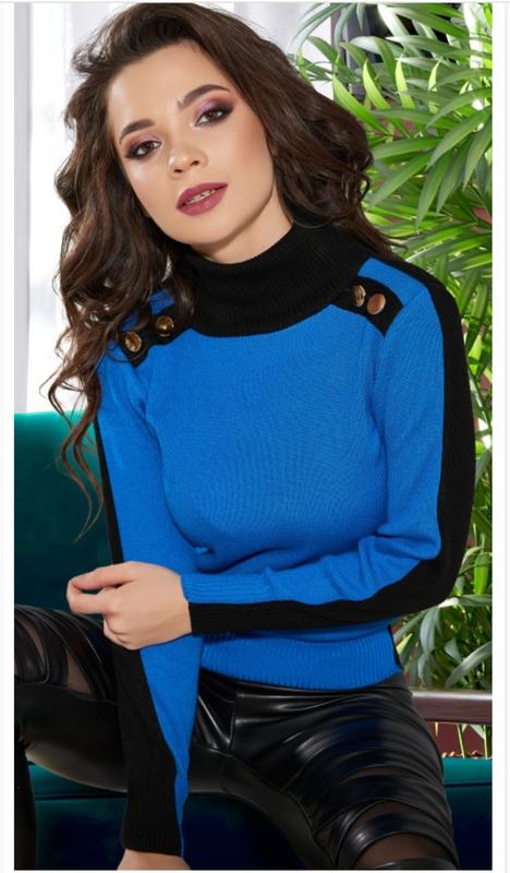 Очень мягкий и теплый свитер. Высокая стойка. На плечиках погоны с золотыми пуговицами. Стильный и яркий свитер. Цвет: ярко синий с черным. Размер: 48-52.