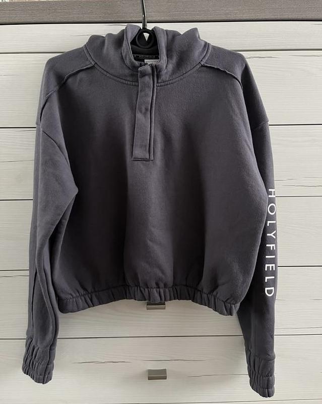 Худи кофта темно серый с надписью бренда holyfield Длина 55 см Длина рукава от горловины 67 до резинки полностью 74 см ПОГ 57 см Талия резинка 41 см хорошо тянется Худи с капюшоном укороченный английского бренда George Holyfield. Утепленный, с начесом. Рукава с манжетом, Тканина - 65% бавовна, 35% поліестер. Размер указан Л, 14-16 лет Можно на девушку невысокого роста
