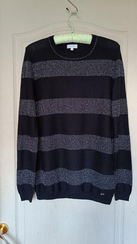 Шикарный свитер в полоску от люксового бренда ESCADA sport. Нарядный, тонкий, легкий, мягкий, приятный к телу (не колется). Состав: 45% полиамида, 42% вискозы, 10% шерсти, 3% кашемира. Цвет насыщенный черный. Сверху как вышивка полоски из серебристого люрекса в змеиный принт. Крой классический прямой. Ребристые манжеты на рукавах, горловина и низ свитера. Состояние идеальное, новой вещи. Без дефектов. Размер указан S. Лучше сядет на М. Ориентируйтесь на замеры: Ширина плечи – 37 см ПОГ – 46 см Длина по середине спинки – 67 см Длина рукава – 64 см, длина плеча 12 см. Все замеры сделаны без растяжения. Свитер тянется.