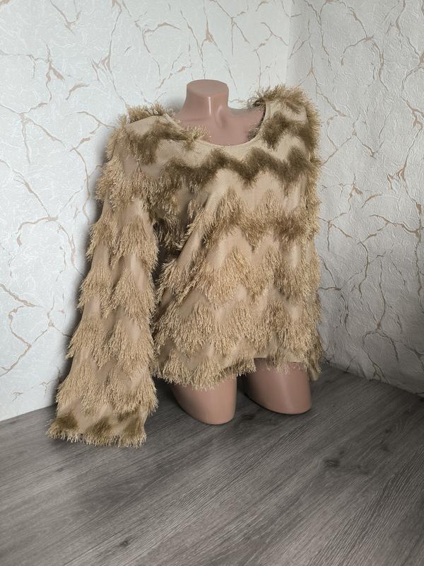 Нарядный свитер бежевый с зигзагообразной бахрамой. Довжина 57 НО під руками 45 НО стегон 51 рукав 60 плечі по спинці 39