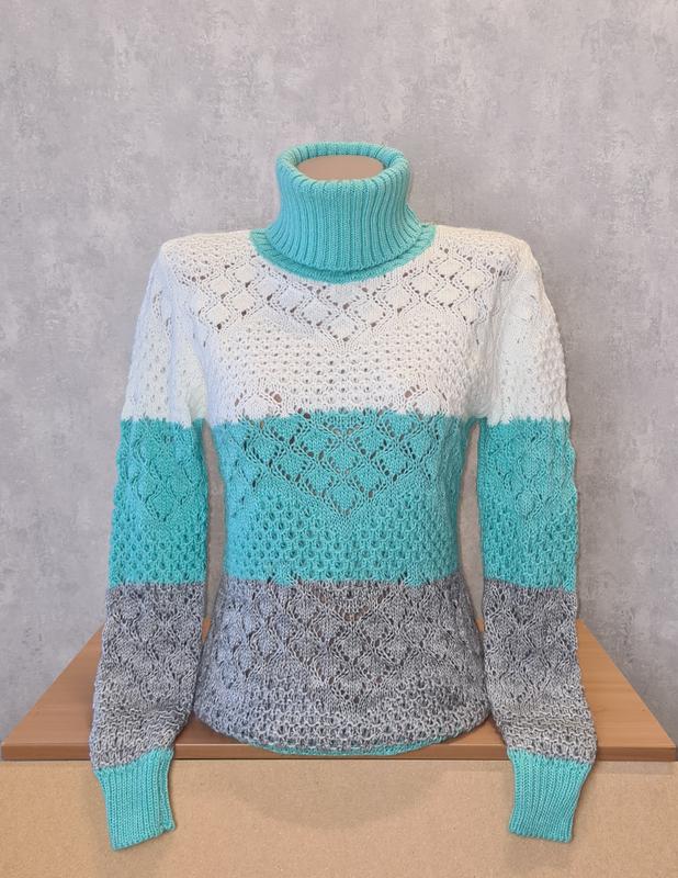 Очень красивая ажурная вязка, теплый свитер с горловиной от турецкого производителя New Dishy. Цвет светло-зеленый, белый и серый. Размер 44-46: объем по груди 88 см, объем по талии 80 см, объем по низу 72 см (ще может растягиваться), плечо 8см, рукав 65 см, длина горловины 20 см, длина свитера 59 см. Состав: 30% шерсть, 70% акрил.