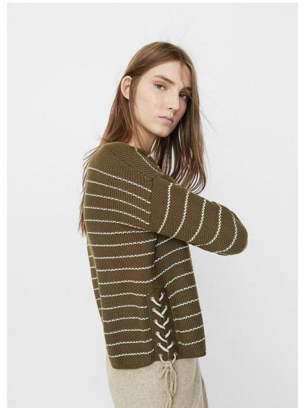 Светр Mango гарної якості трохи вкорочений, спущений рукав, з боків декоративні шнурки. Є ледь помітна нитка люрексу. Склад : 46% акрил, 42% бавовна , 8% поліестер, 4% металік Розмір М : довжина від плеча - 52см, ширина по спинці - 55см, рукав від ворота - 66см, внутр.довжина рукава -43см;