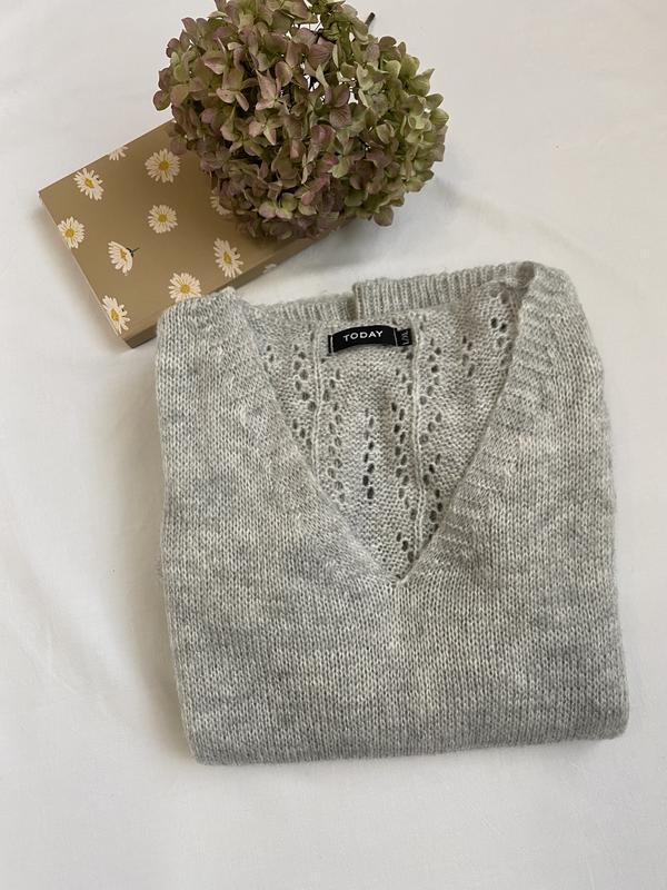 Легкая вязаная кофта размером L, в составе акрил и шерсть, средней плотности, с ажурной вязкой на спине, длина 63см., полуобхват груди 65см., длина рукава от горловины 69см. Стан нового.