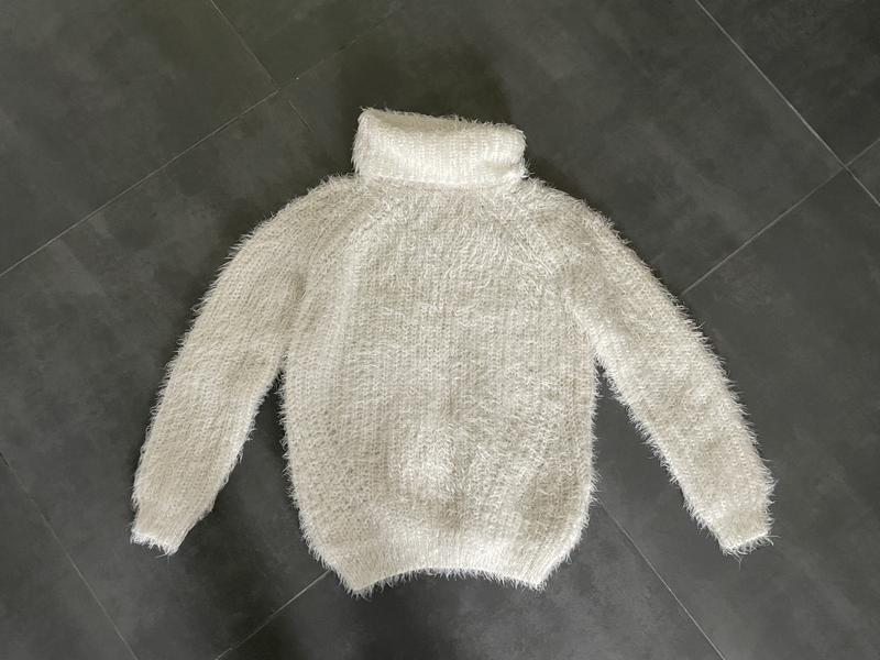 Теплый свитер,белоснежного цвета с горловиной По наборке размер с, но подойдет также на размер м