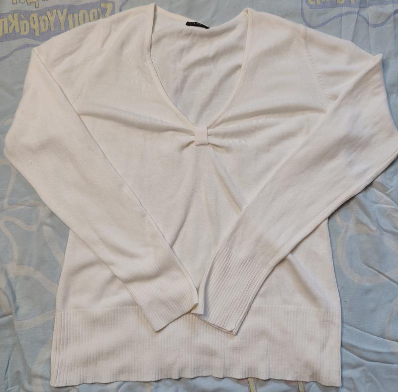 Біленький светр гарної якості 🤍Гарно підкреслює і надає об'єм грудям за рахунок збірки тканини, вау ефект 😍Розмір М-L (44-48) тягнеться. Має манжети на рукавах та по низу) Стан хороший 🙂