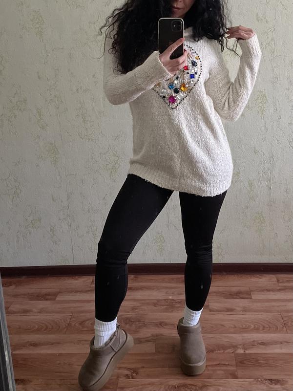 Молочный свитер прямого кроя.. Очень уютный и мягенький. На груди выложено сердце цветными камушками.. Хорошо подходит с лосинами и джинсами.. размер S