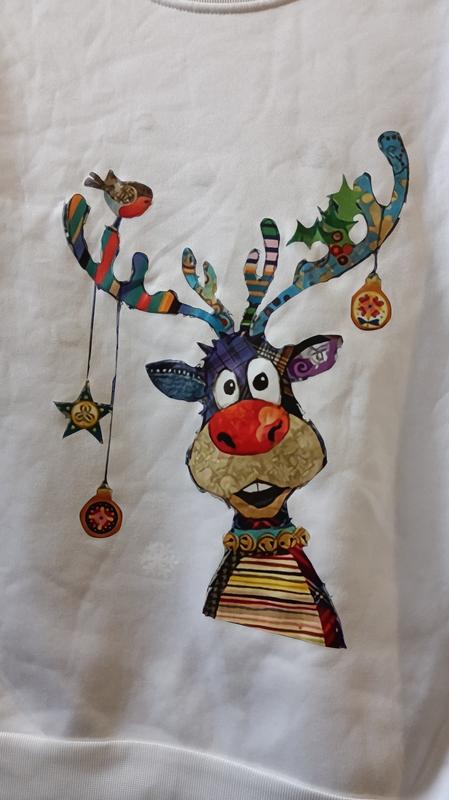 Розмір М Приємна на дотик з середини м'якенька Дуже гарна біла різдвяна кофта з принтом веселим оленем з рогами і пташкою з ішрашками