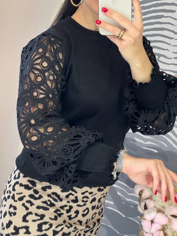 Надзвичайно красива, елегантна і ефектна кофточка вільного крою на резинці вгорі і внизу з чудовими об'ємними рукавами з ніжного мережива з дивовижним візерунком кофточка виготовлена з якісного і приємного до тіла трикотажу машинної в'язки, вона підкреслить вашу красу, і відмінно буде виглядати на діловій зустрічі, романтичному побаченні і вечірнику з друзями розмір універсальний 42-46 довжина 56-58 см, пг 48-50 см добре тягнеться, довжина рукава від шиї 70-72 см