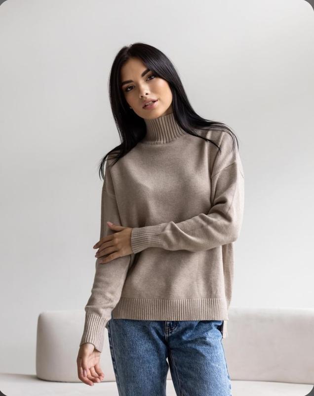 Свитер в цвете капучино с удлиненной спинкой, и разрезами по бокам. Состав: 70% хлопок,25% вискоза,5% эластан. Замеры: Рукав 50 см ПОГ 58 Длина 58/64