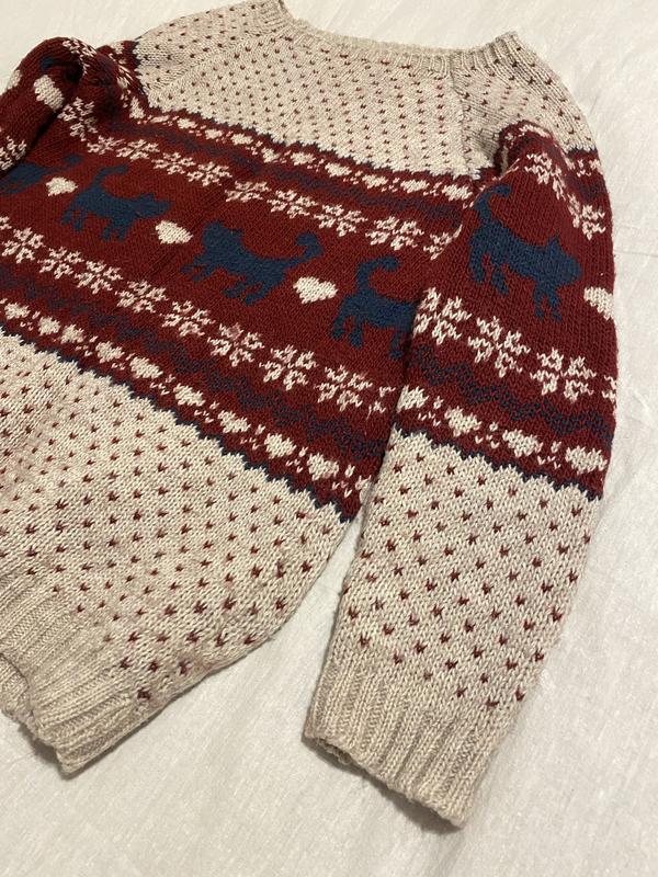 Кофта з кицьками. Дуже тепла. Горловина широка. Ззаду трошки подовжена. Машина вʼязка Розміри: від плеча до низу - 60 см; довжина рукава від горловини - 60 см; ширина - 41 см