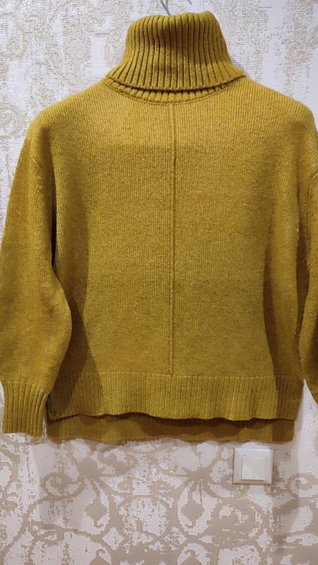 Теплий светер з горловиною, гірчичного кольору, розрізи по швах, стан гарний.НОГ 60, рукав реглан від горловини 76, НОБ60, довжина спинки 67, довжина перед 60.