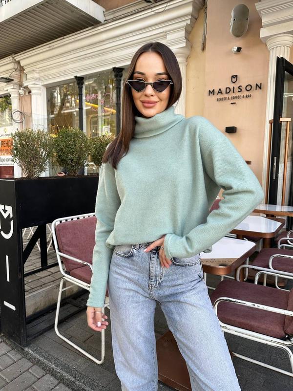 Жіночий светр з високим коміром Арт. 41859, 41856, 41853, 41850, 41839 ▪️ матеріал: ангор в'язка ▪️ колір: бежевий, темно-сірий, оливковий, синій, рожевий ▪️ розміри: 42-46 Орієнтовані заміри по готовому виробу: 42-46 (ОГ 104, довжина 67, довжина рукава від горловини 71)