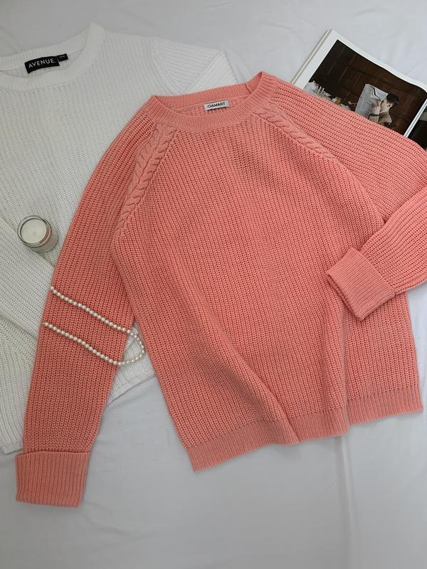 Нежный персиково-розовый свитер Размер S Длина 63 см Полуобхват груди 50 см Рукав от горла 64 см Материал: 30% шерсть, 70% акрил Стан: нового