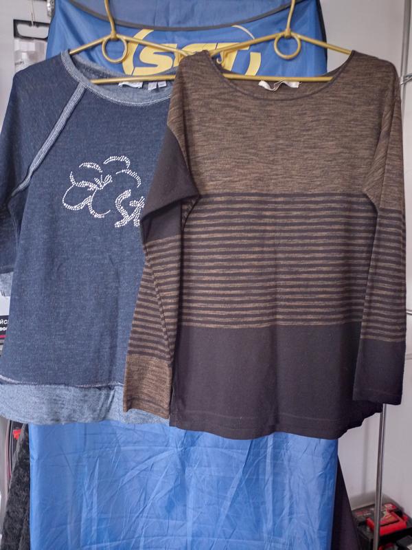 Темно синяя- длина 70, в груди 50, рукав-3/4. Коричневая с черным- длина 70, рукав 62, в груди 50. Хорошее состояние.