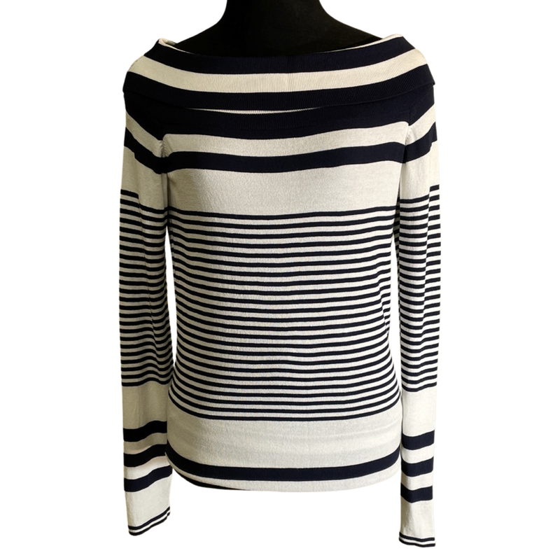 Джемпер Comma Мягкая вязка, приятный трикотаж. Красивая горловина, которая позволяет разнообразить образы, например, оголить плечо. Пошив полоска в полоску, качество отличное. Цвет: сочетание белого и темно-синего. Размер из бирки - 38 (М), легко подойдет и на S Состав ткани: 76% вискоза, 24% полиамид. Замеры: Плечи - 40 см. Объем груди – 90 см. Длина - 70 см. Длина рукава – 60 см. Новые, бумажные бирки отсутствуют. Условия отправки и покупки: 🚖 Отправка всеми логистическими компаниями 💳Оплата на карту 💯Безпечна оплата Shafa