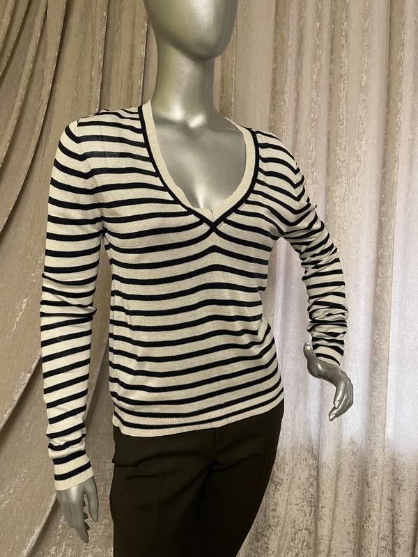 Полосатый свитер с V подобной горловиной. Бренд Minimum. Размер S. Состав: натуральный. Замеры: Длина - 64 см. Ширина - 45 см. Длина рукава - 72 см. Есть небольшой дефект, который можно легко исправить, показан на фото. Условия отправки и покупки: 🗣 Из личного гардероба 🚖Отправка всеми логистичными компаниями 💳Оплата на карту 💯Безпечна оплата Shafa