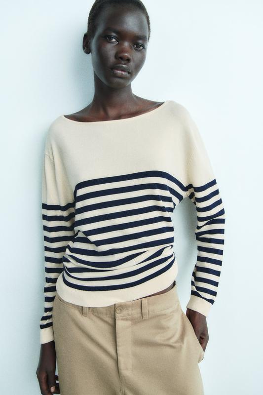 Свитер Zara р. L/40/12 Состав:85% вискоза, 15% полиамид. Цвет - бежевый и темно-синий.