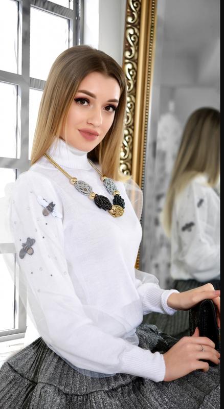 Красивый белый свитер. Рукава из сеточки, а под ними россыпь страз и пайеток. Насекомые - пчелки расшиты бисером и пайетками. Свитер хорошего качества. Мягкий, комфортный с высоким горлом. Растяжимость хорошая. Размер: 42-50