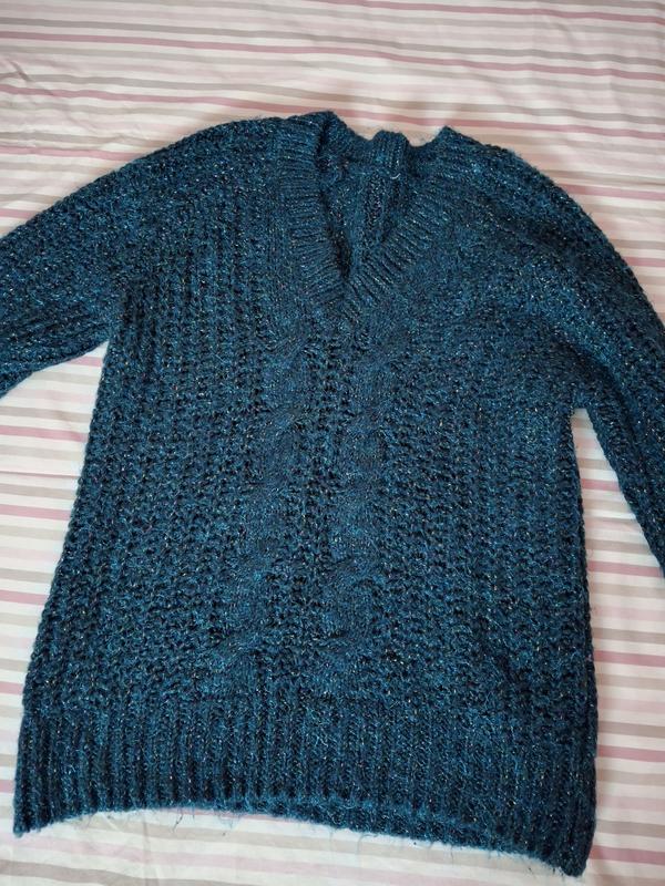 джемпер, изумрудного цвета с блеском, косичка впереди, рукав реглан, длина рукава 78, по спинке 64 см, пог 56. вырез мыс. размер ориентироваться по замерам. изделие хорошо тянется. подойдет на новогодние праздники, для встречи нового года - года змеи.